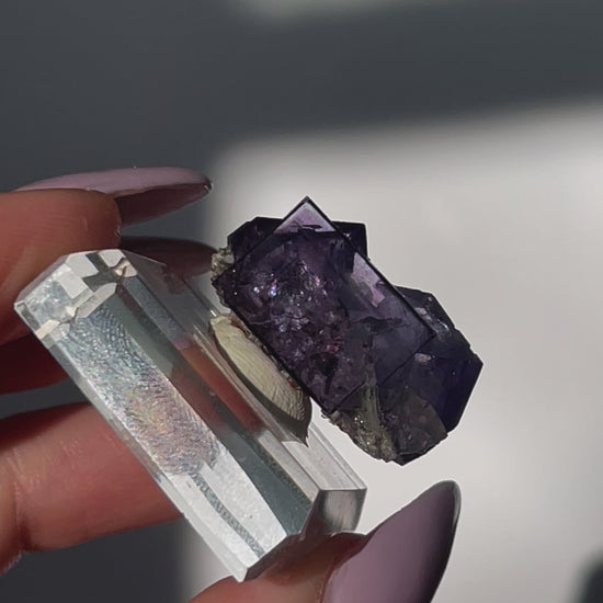 Yagangxian (YGX) Purple Cubic Fluorite with Quartz point, Epidote and Mica at the base - high clarity